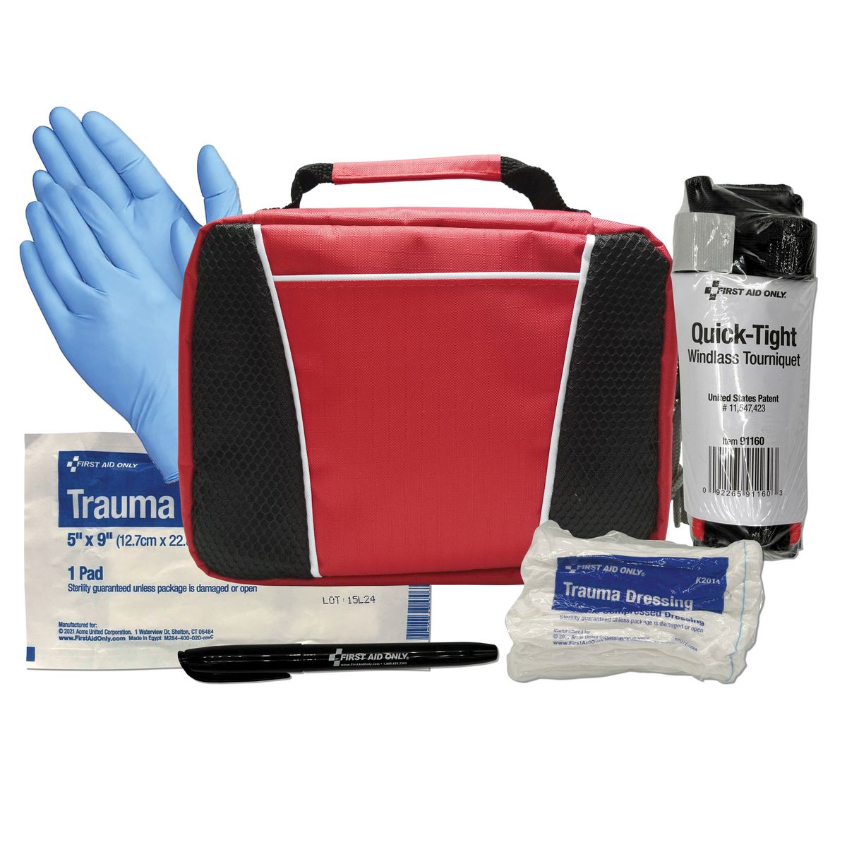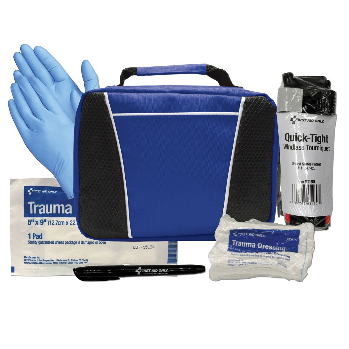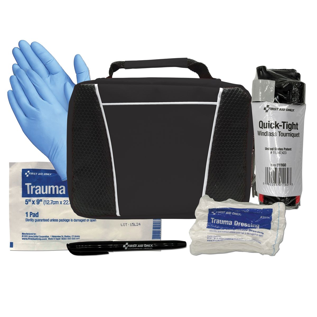 For extreme situations, we have you covered. Uncontrollable loss of blood is a terrifying situation to be in, and this kit offers a solution. Tourniquet, trauma dressing and pad with nitrile gloves offer temporary emergency support until help arrives. There is also a pen for note keeping and tracking tourniquet release times.