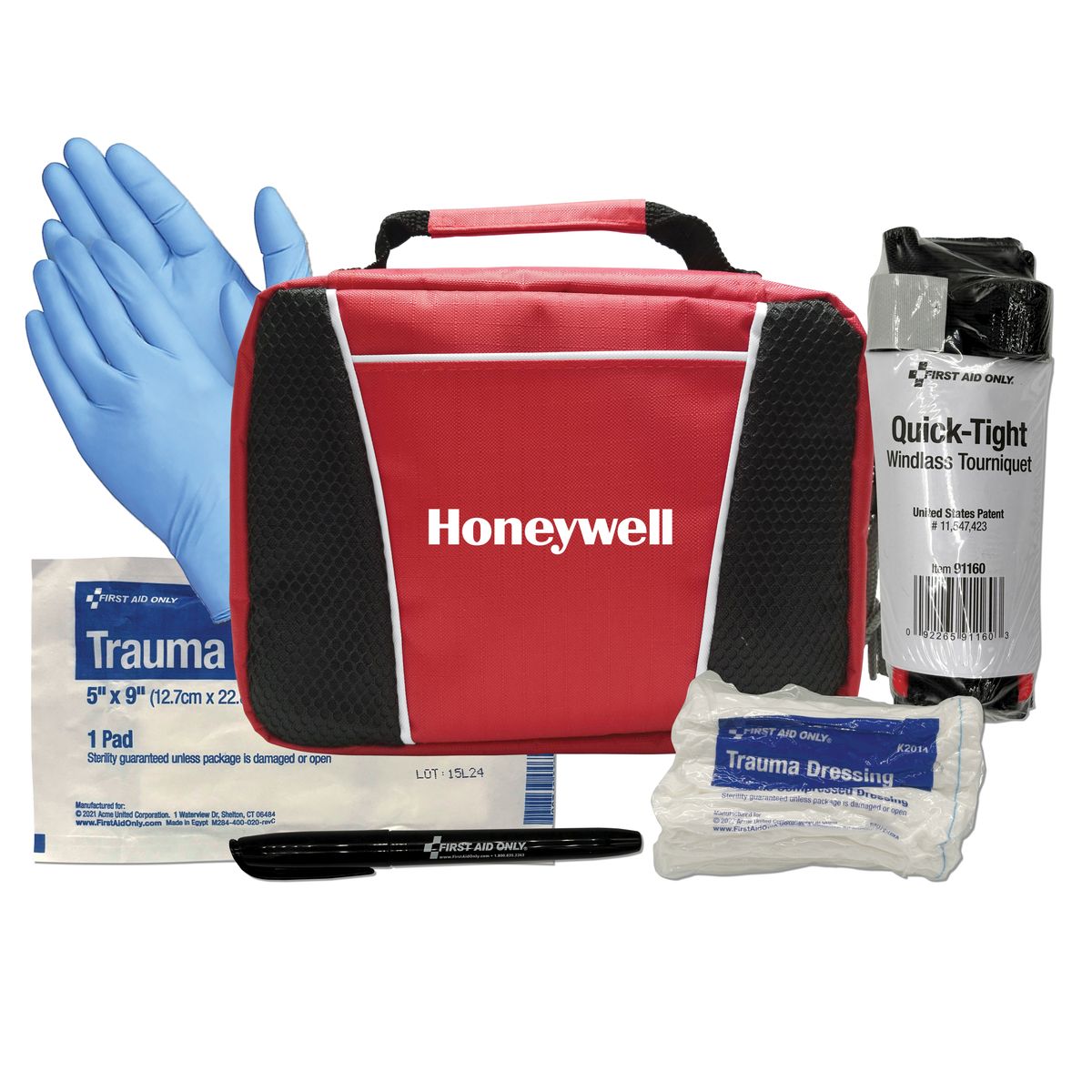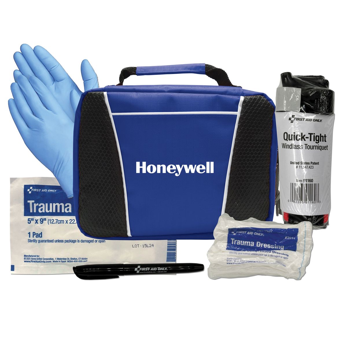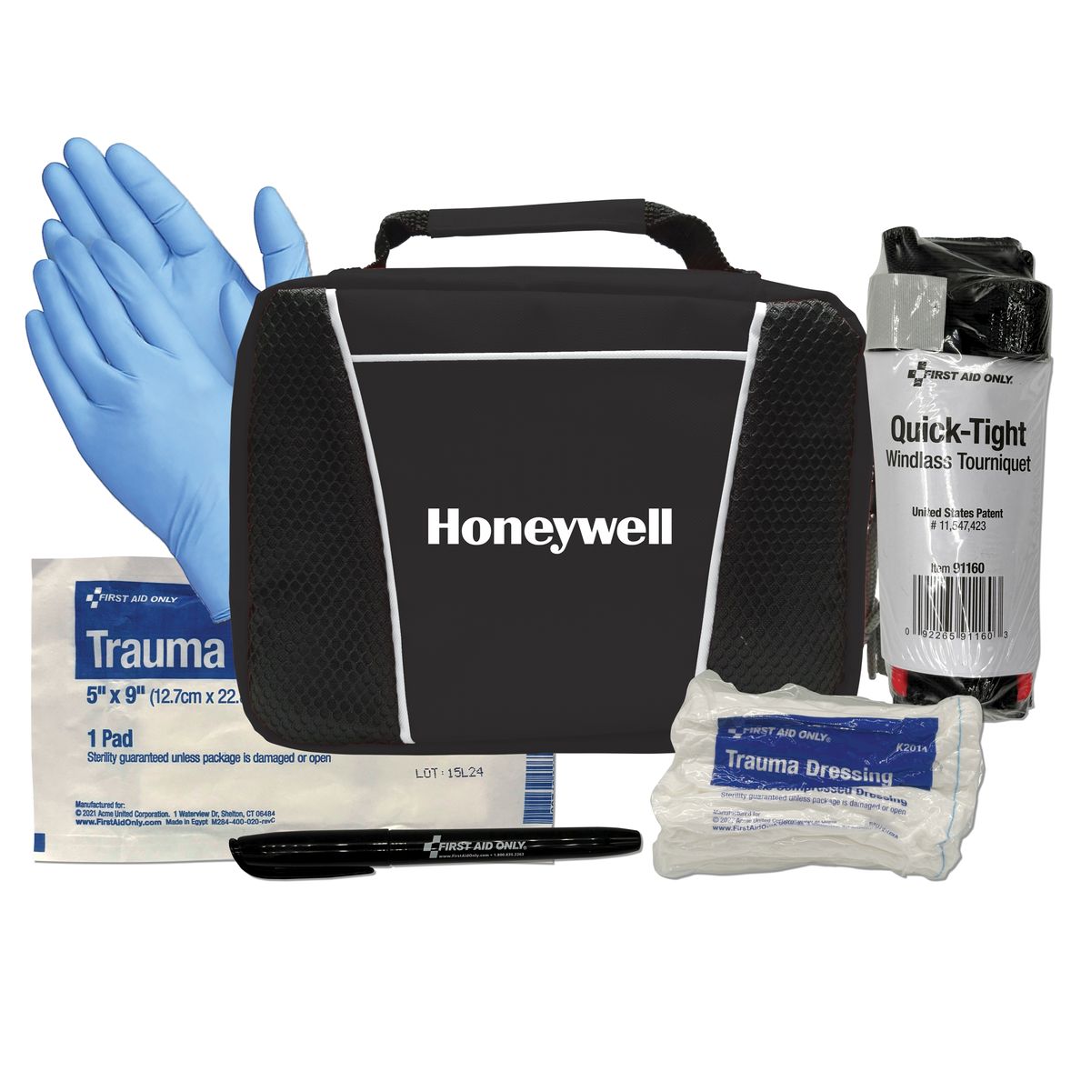 For extreme situations, we have you covered. Uncontrollable loss of blood is a terrifying situation to be in, and this kit offers a solution. Tourniquet, trauma dressing and pad with nitrile gloves offer temporary emergency support until help arrives. There is also a pen for note keeping and tracking tourniquet release times.