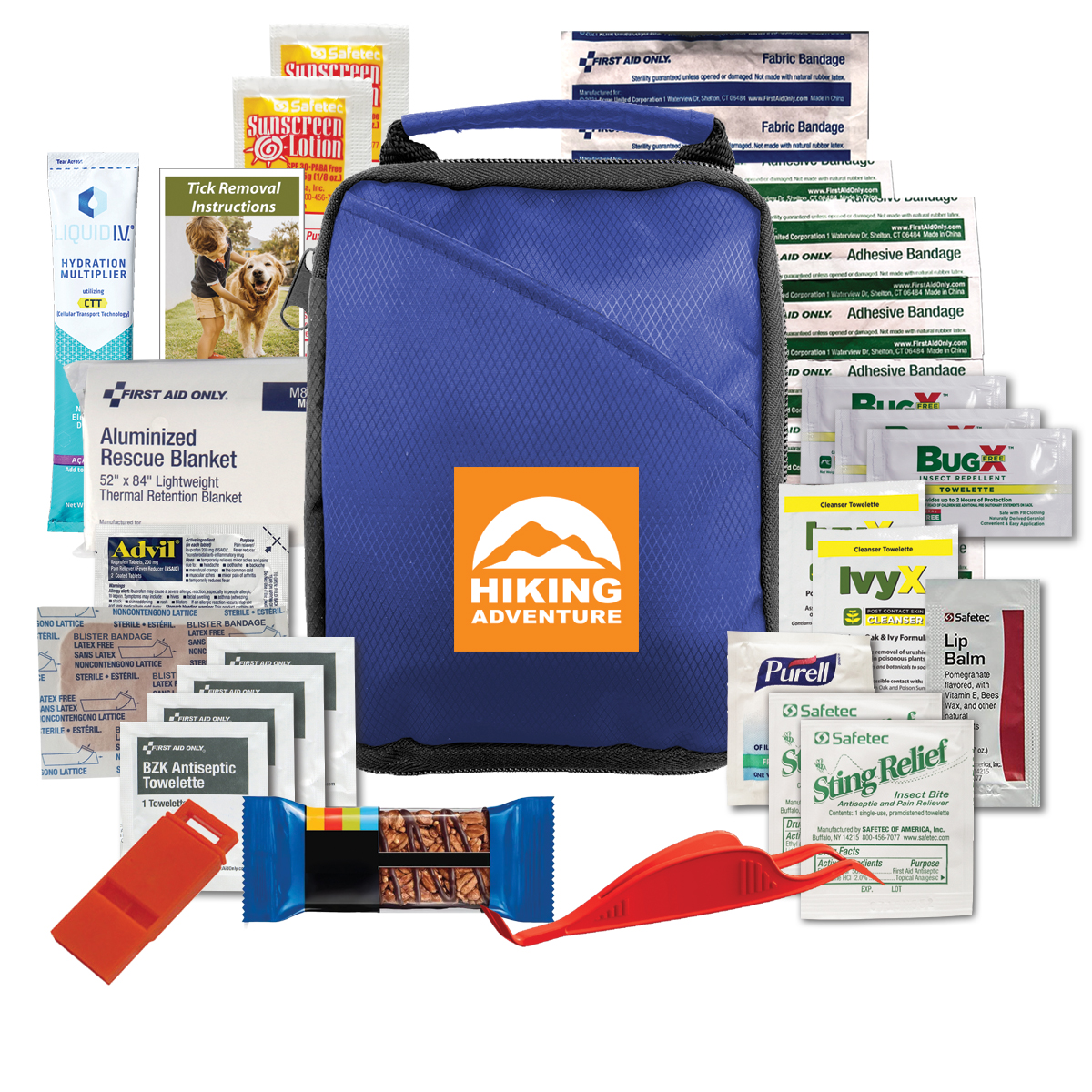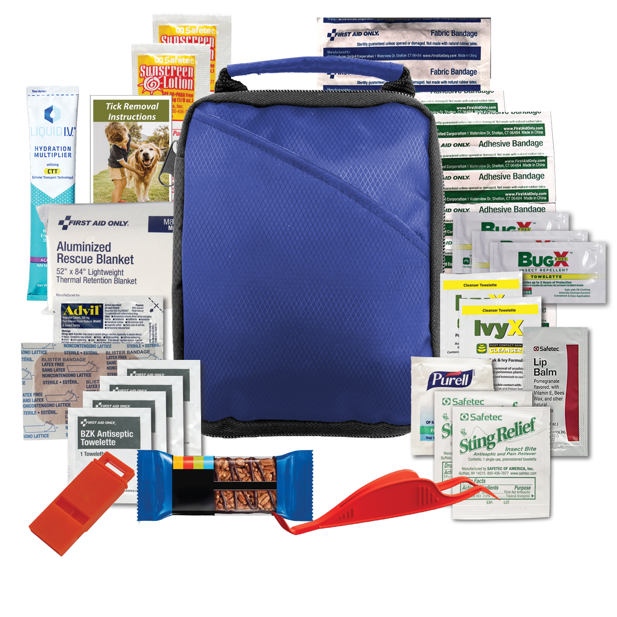 Includes: (1) First Aid Basics Guide, (4) Adult Bandages, (10) Junior Bandages, (1) Purell Anti-bacterial Wipe, (4) BZK Antiseptic Wipes, (2) Sting Swabs, (1) Blister Bandage, (1) Lip Balm Packet, (2) Sunscreen Packets, (1) Advil Pain Reliever Packet, (1) Thermal Emergency Blanket, (1) Emergency Whistle, (1) Granola Bar, (1) Liquid IV Hydration Multiplier Electrolyte Drink Mix, (1) Tick Tool Tweezer Combo, (1) Tick Removal Instructions, (2) Poison Ivy Wipes, (3) Insect Repellent Wipes