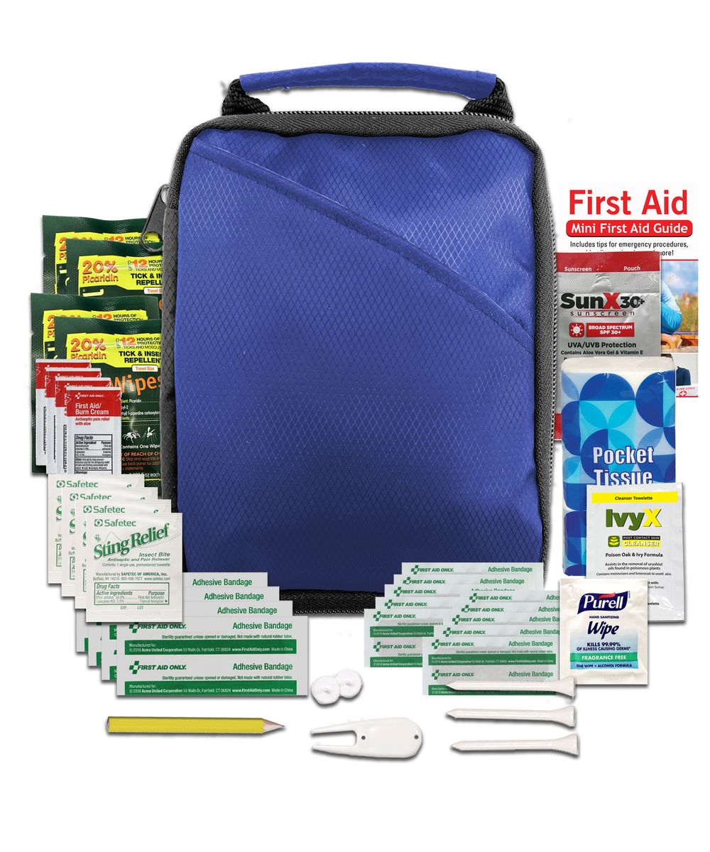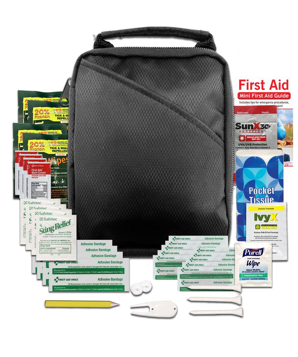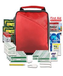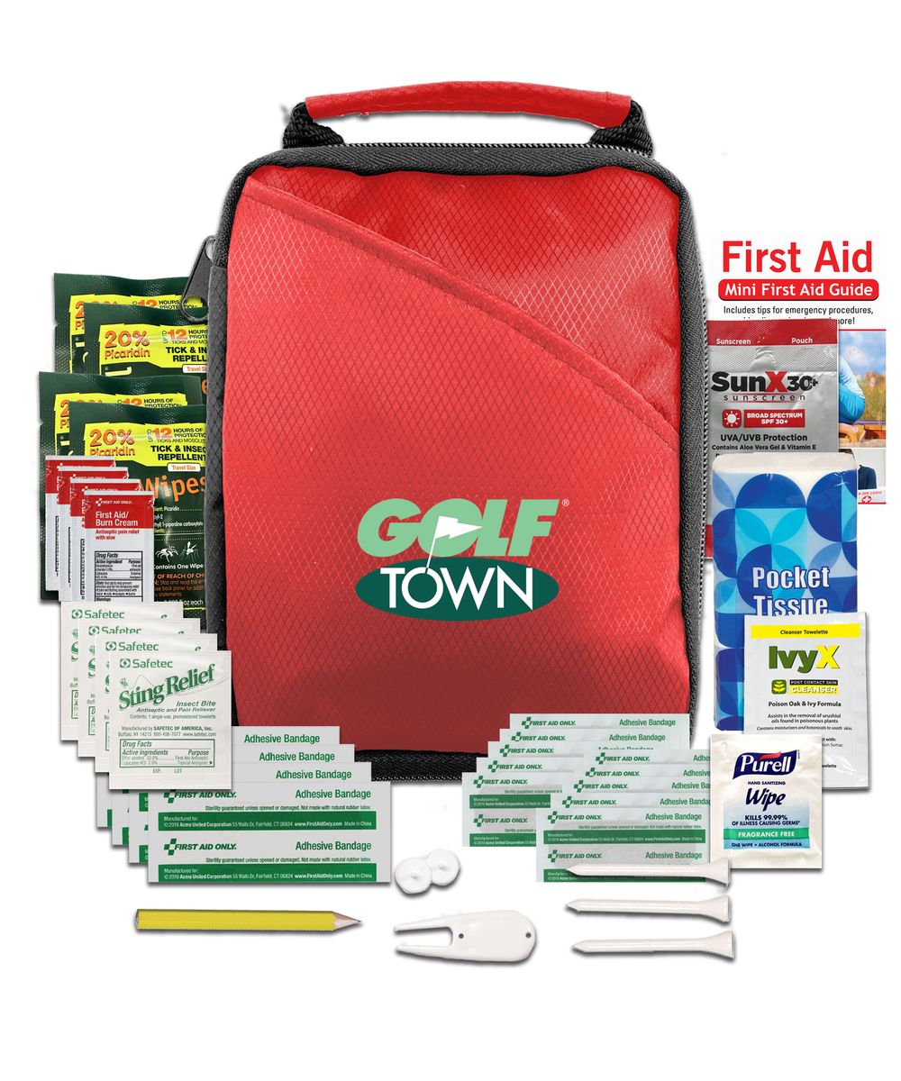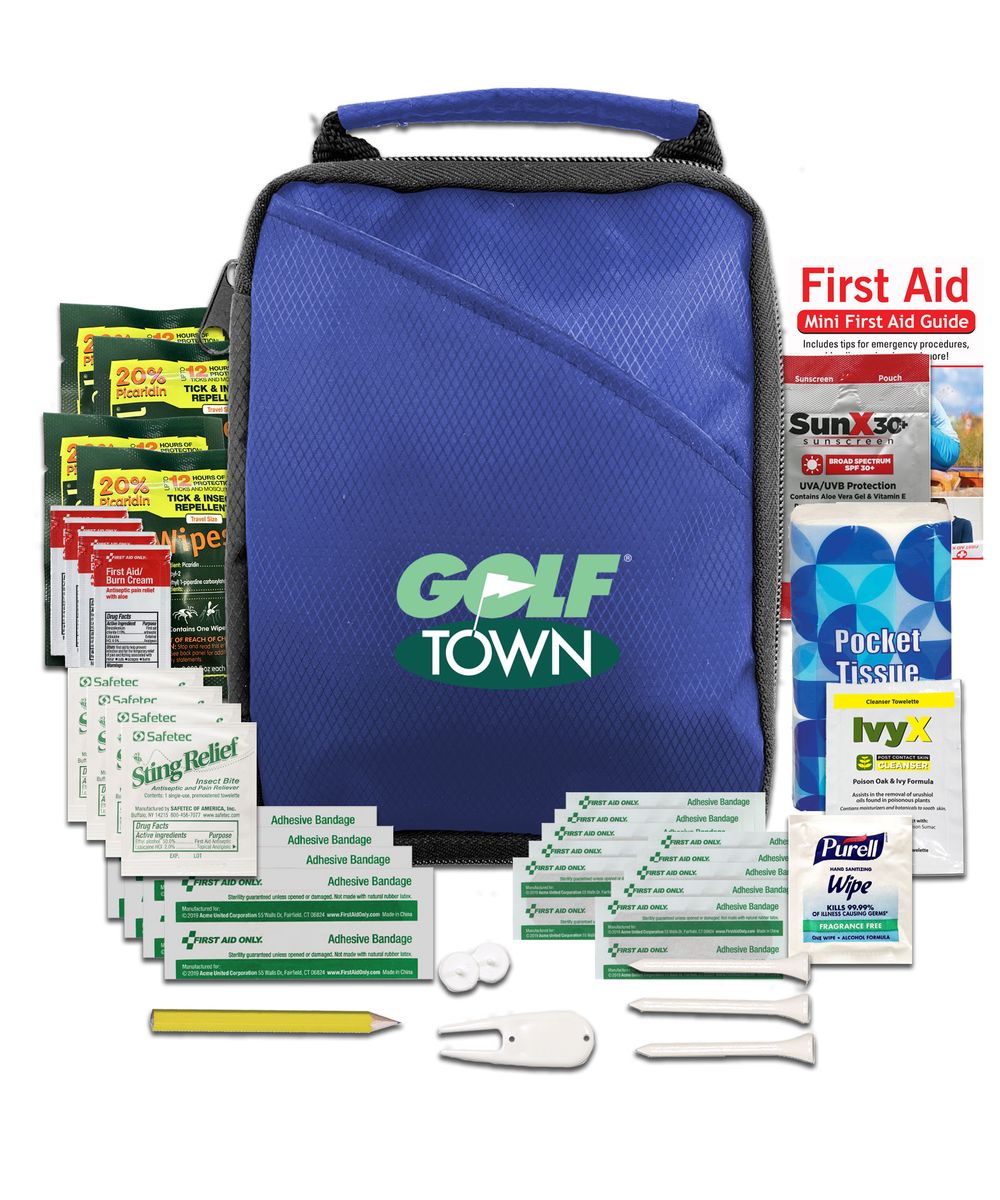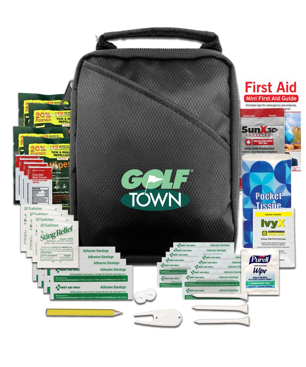 Score a hole-in-one with your customers with this deluxe golf kit. The kit includes an array of quality contents that help you keep your focus on the game, including insect repellent wipes, sunscreen, first aid basics, and golf essentials. The durable pouch features an outer pocket and handle for easy travel. Add your logo or customer message for a golf-themed giveaway that's sure to be a hit!