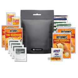 Includes 2 Sunscreen Packets, 4 Adult Bandages, 10 Junior Bandages, 1 Purell Anti-bacterial Wipe, 4 BZK Antiseptic Wipes, 1 Lip Balm, 2 Handwarmers, and 2 Toe Warmers