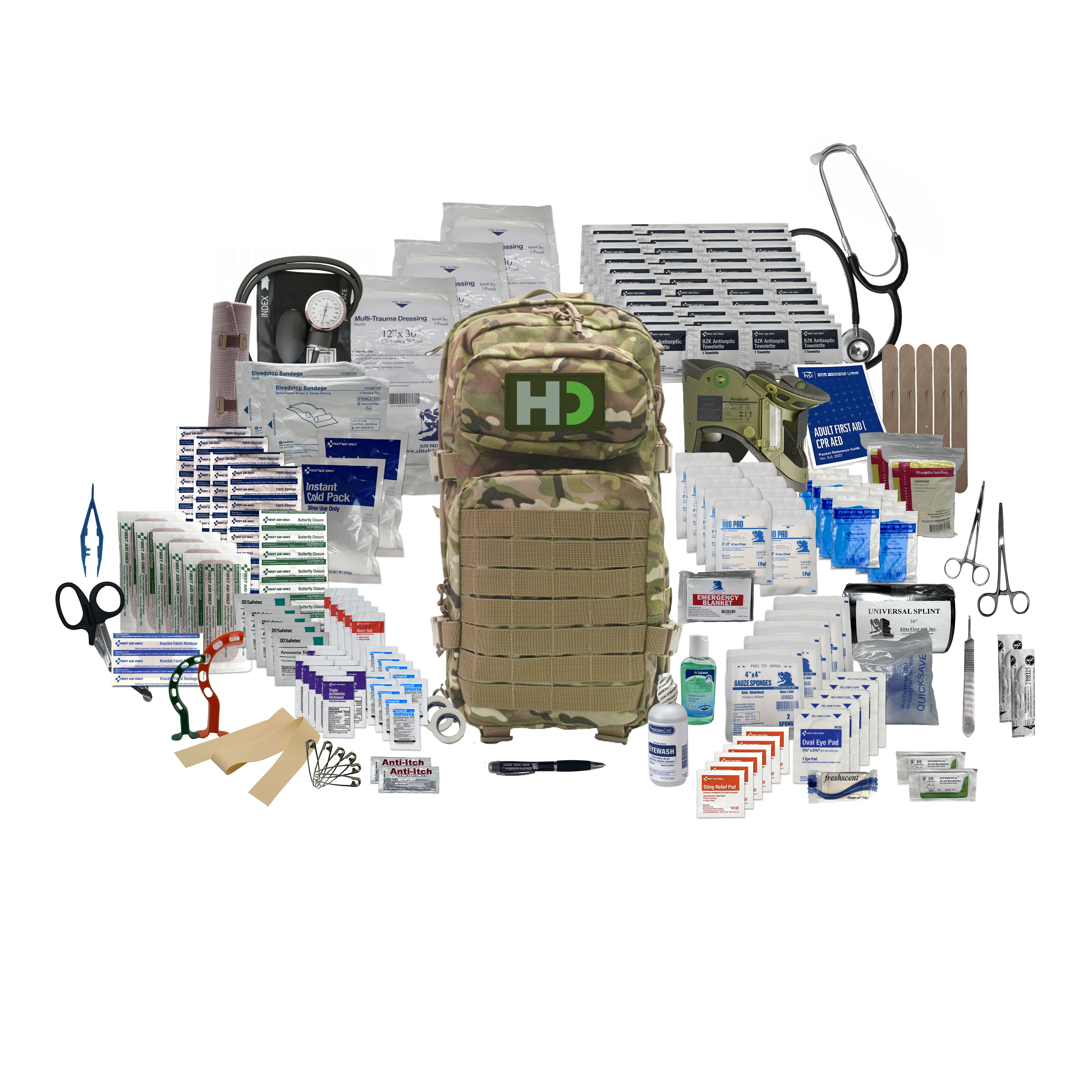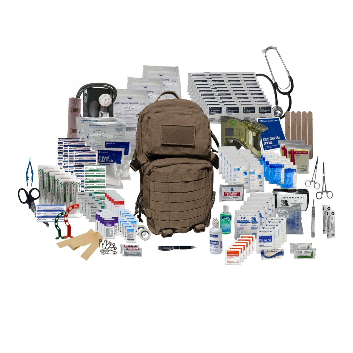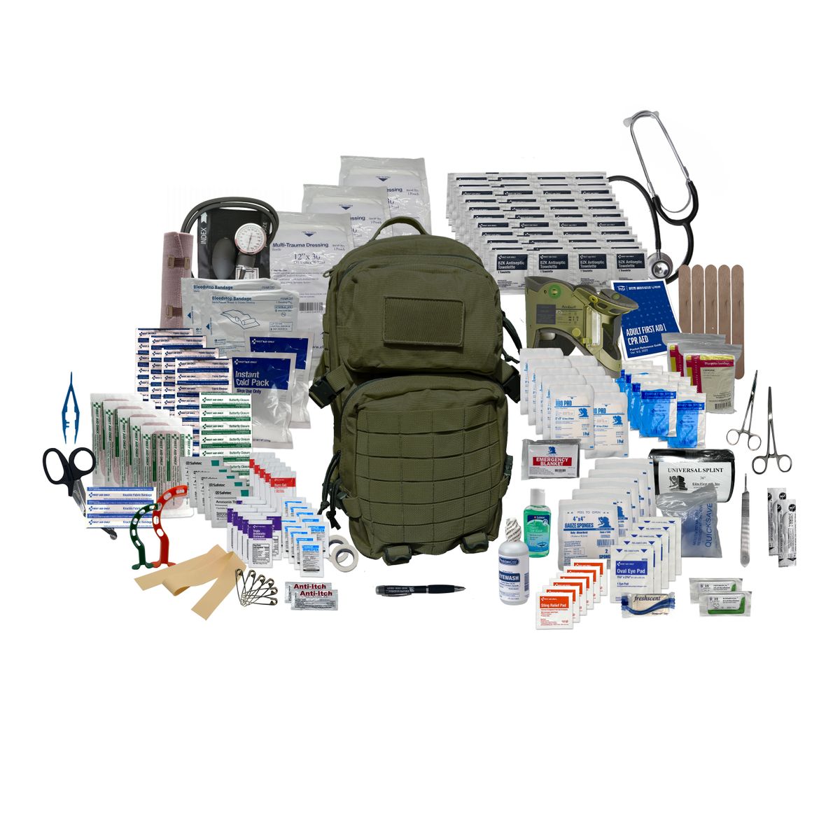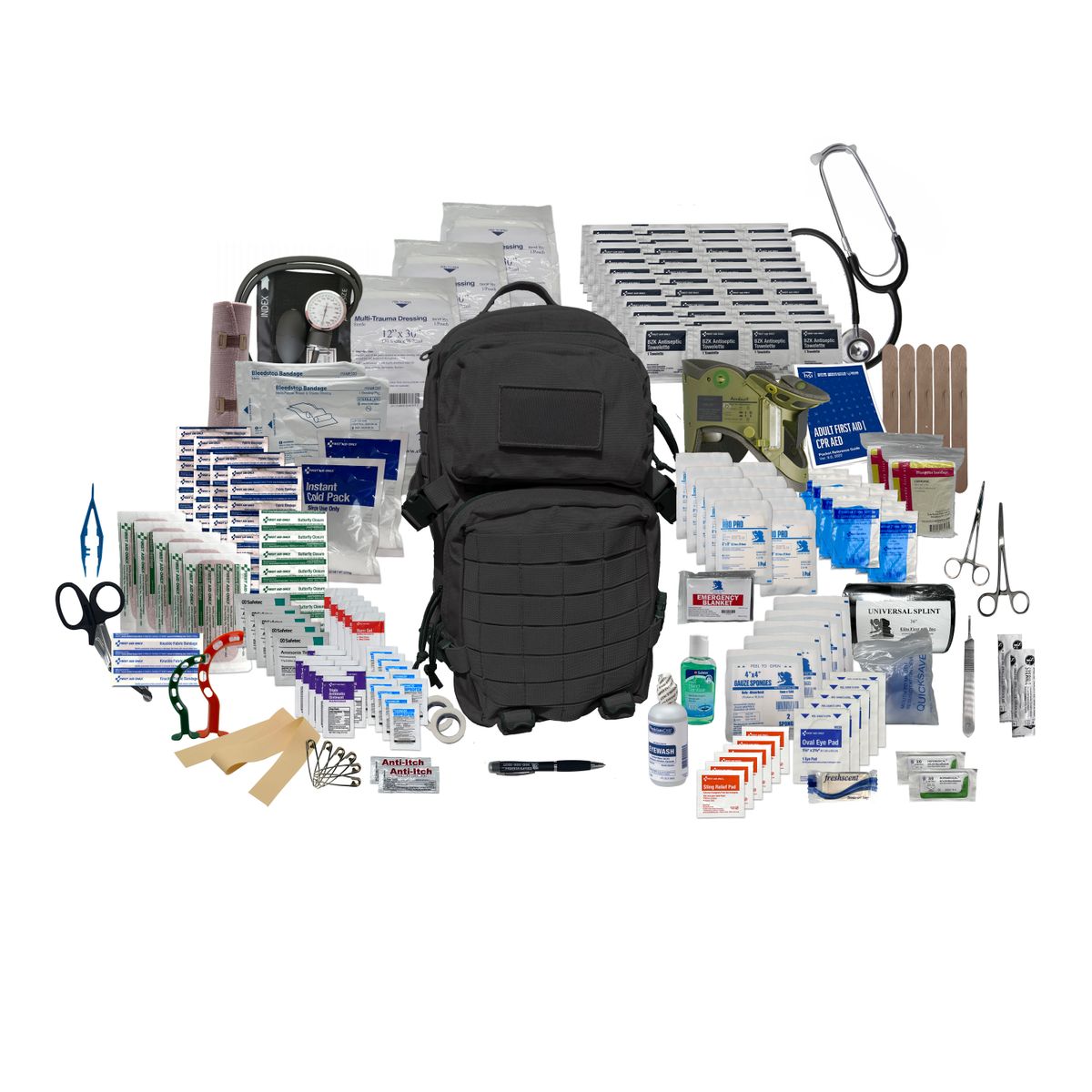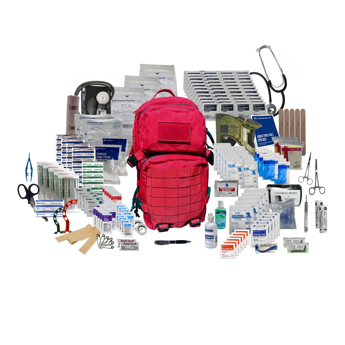 Additional InformationIncludes: (1) Blood Pressure Kit, (1) Cervical Collar, (1) Stethoscope, (1) LED Pen Light, (2) Sutures, (1) First Aid Guide, (8) Pair of Nitrile Gloves, (10) 5” x 9” Abdominal Pads, (20) Pain Relievers, (6) Safety Pins, (2) Emergency Thermal Blankets, (1) 2oz Bottle of Hand Sanitizer, (2) Packets of Anti-Itch Gel, (1) Bar of Hand Soap, (5) Sting & Bite Wipes, (1) Universal/Sam Splint, (1) 6” Elastic Bandage, (5) 4” x 4” Sterile Gauze, (2) 1” Tape, (2) BleedStop Bandages, (5) Eye Pads, (2) Triangular Bandages, (16) 1” x 3” Adult Bandages, (5) Butterfly Closure Strips, (5) 2” x 4” Bandage Strips, (1) Knuckle Bandages, (2) Instant Ice Packs, (1) EMT Shears, (2) Stainless Steel Hemostats, (1) Tweezers, (1) Scalpel Handle, (2) Scalpel Blades, (5) Tongue Depressors, (1) CPR Face Shields, (45) BZK Antiseptic Wipes, (5) Ammonia Inhalants, (2) Oral Airways, (3) Multi-Trauma Dressings, (1) Eye/Skin Wash, (10) Triple Antibiotics, (5) Burn Gel, (1) Latex Tourniquet