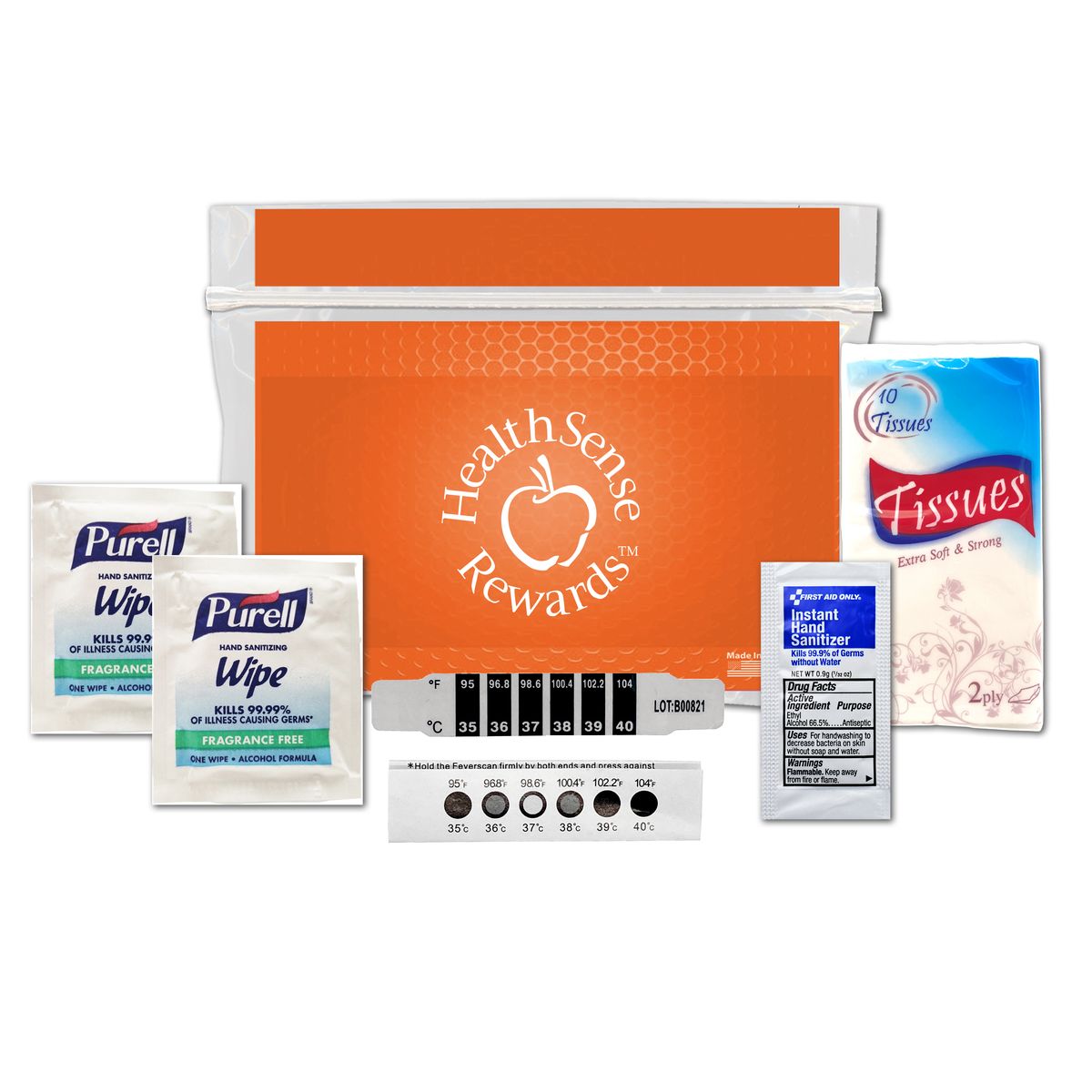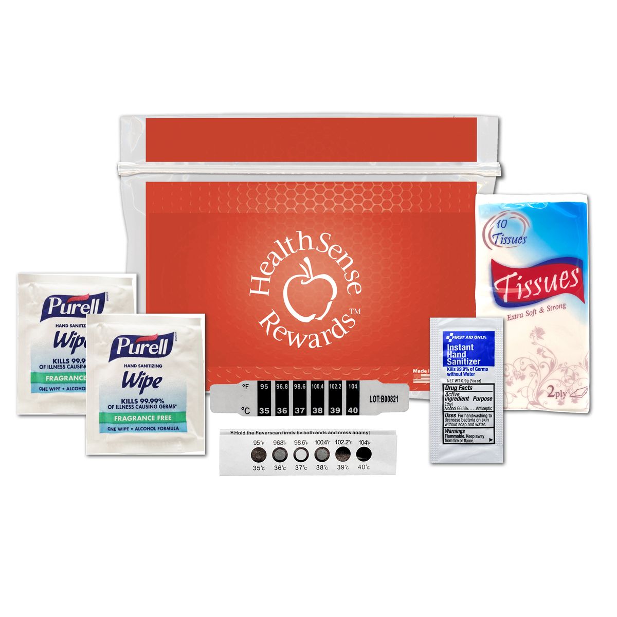 Stay on the ready for anything with this So Healthy cold and flu kit! Inside of a plastic resealable zip-type kit measuring 6" x 5.25" comes a disposable thermometer, hand sanitizer packet, Purell wipes, and a tissue pack. This is available in several different colors and can have a complete look with your custom company name or logo thanks to our heat transfer imprint. This is a great way to promote wellness! Imprint colors in black or white only.