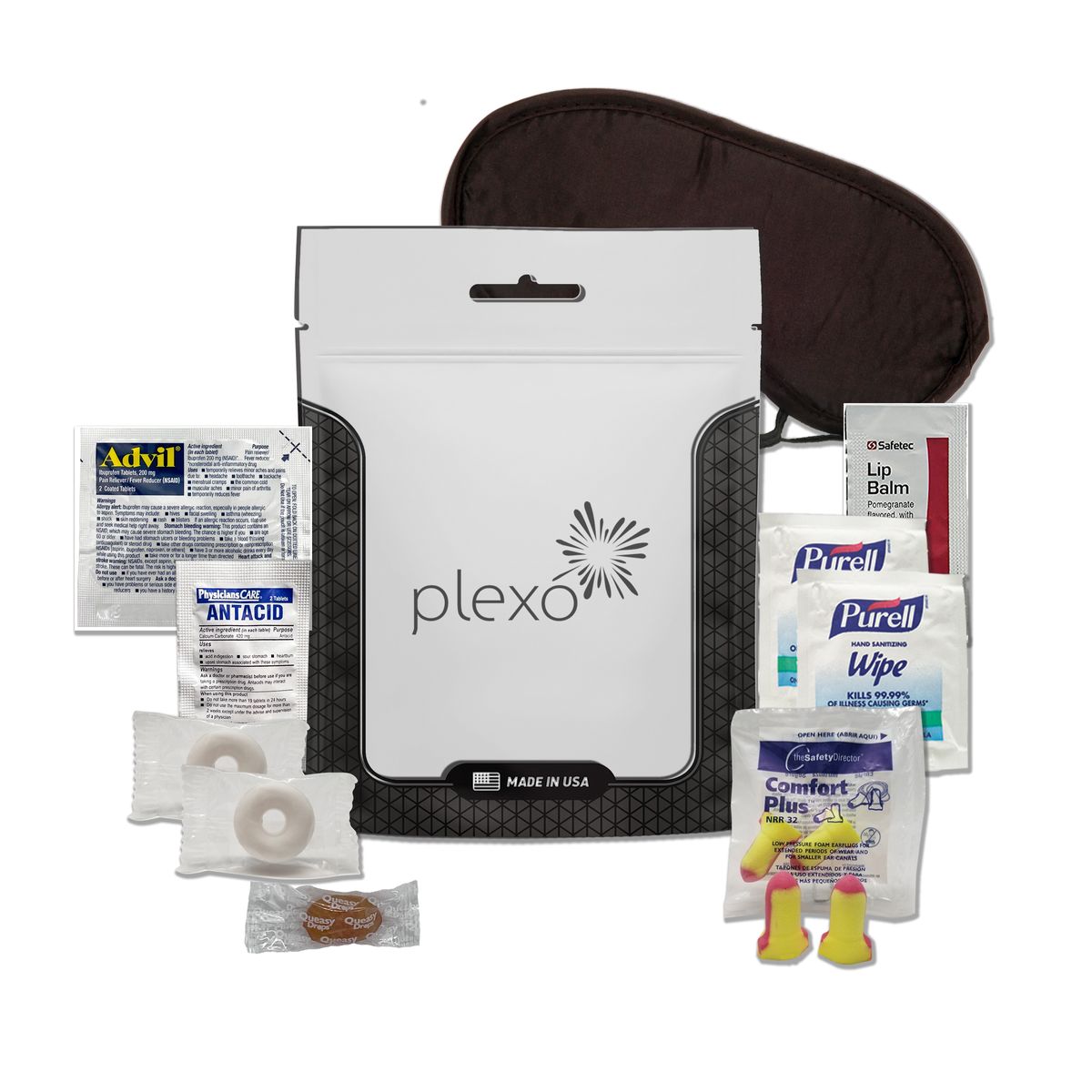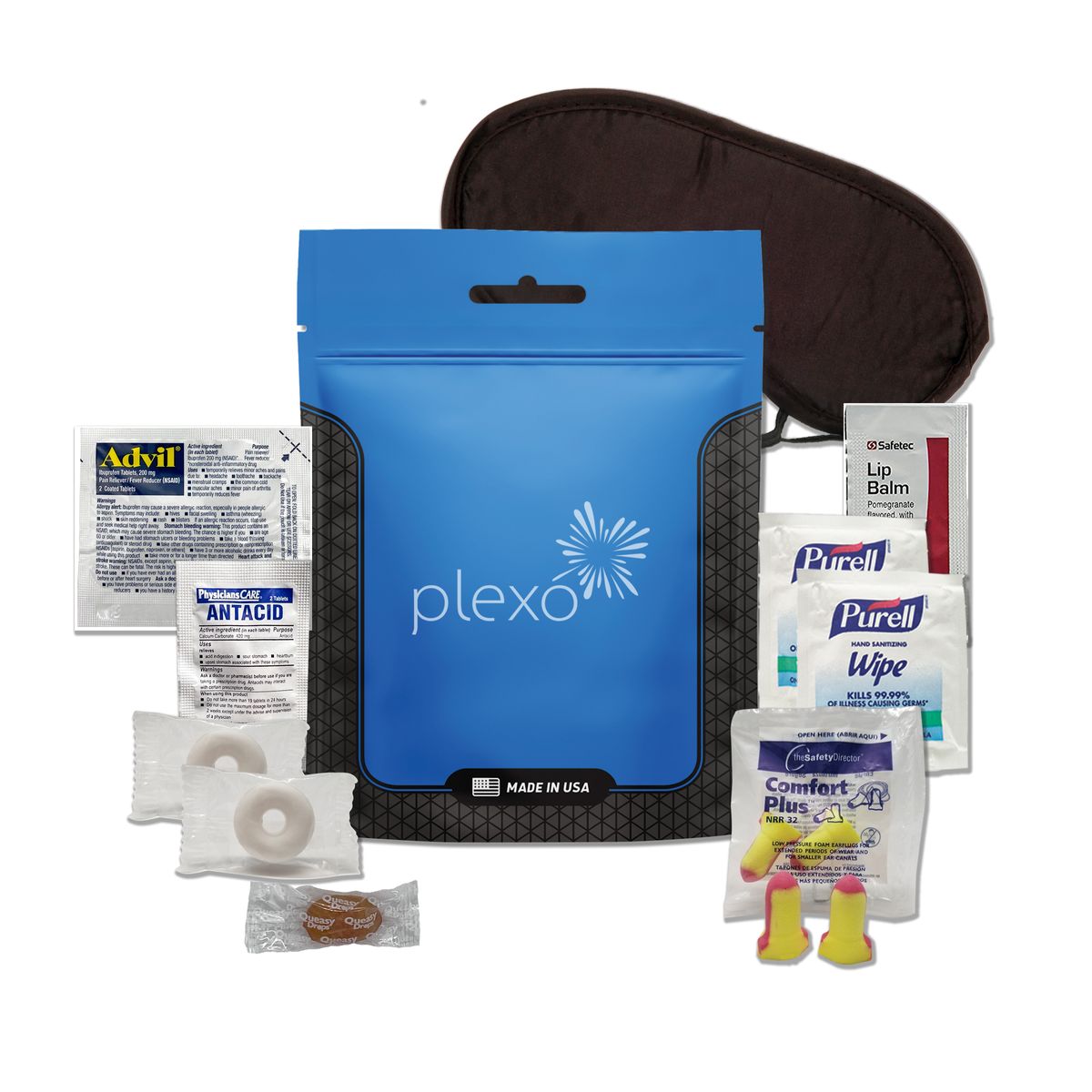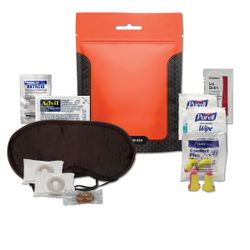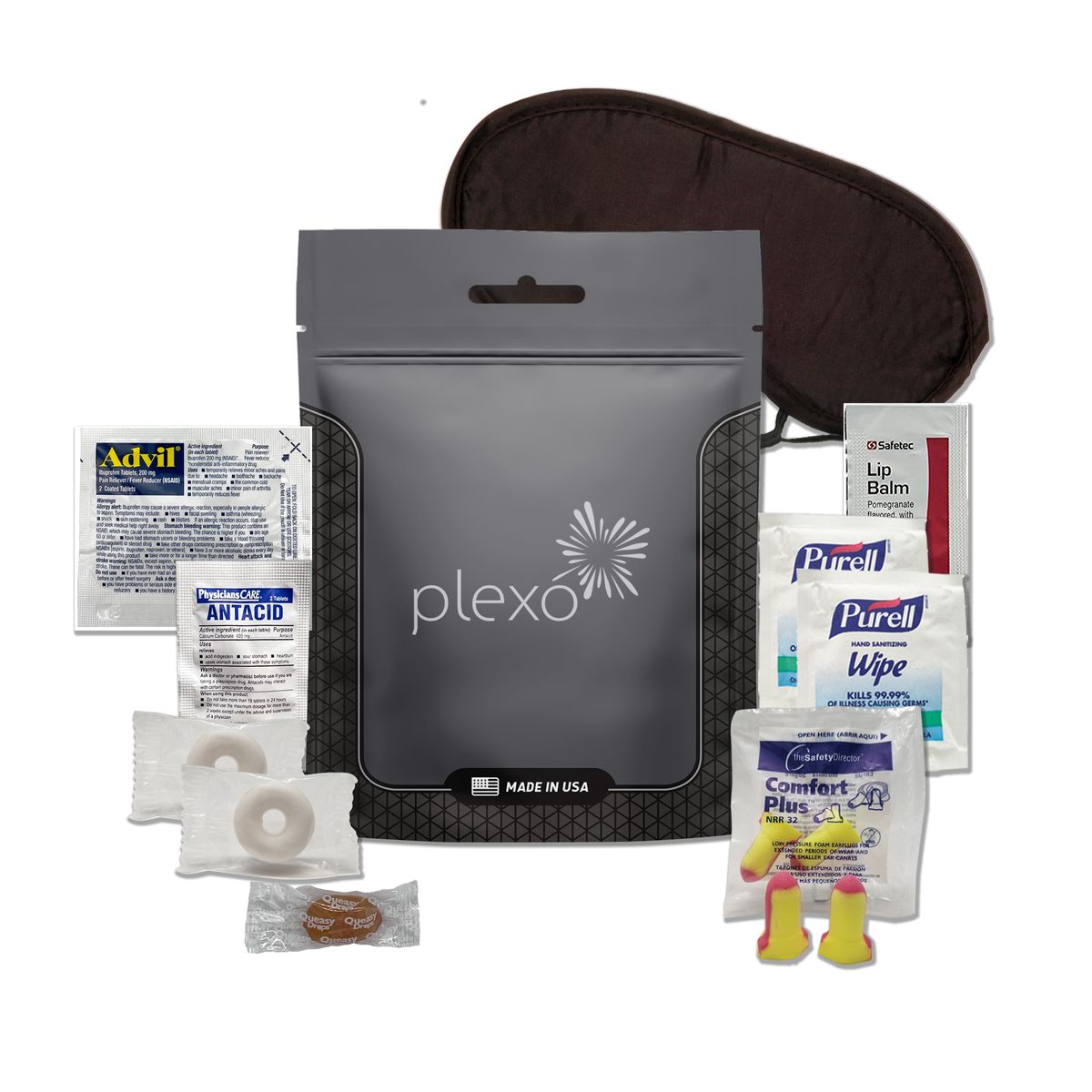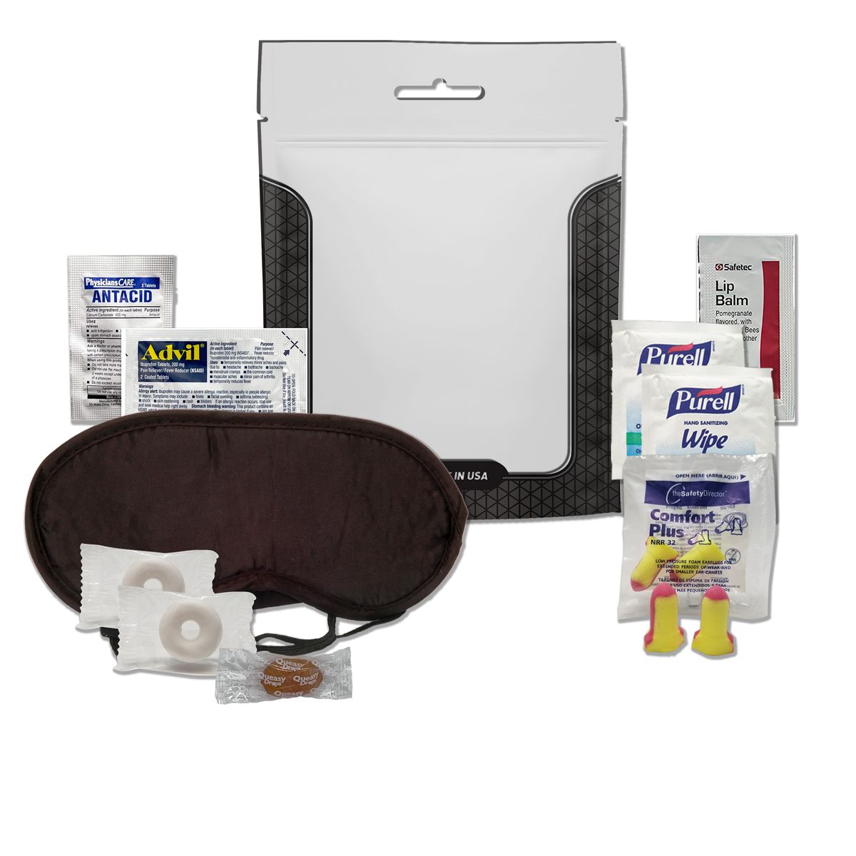The night of a long night of socializing requires some unique tools to help offset the day after. Put your eye mask on, ear plugs in and choose your defensive weapons, Advil, Antacid Tablet, Lip Balm and Purell Wipes. Imprint colors in black or white only.